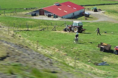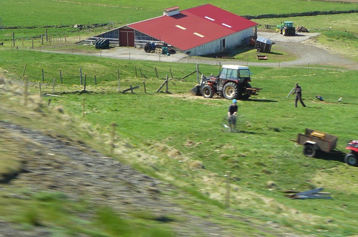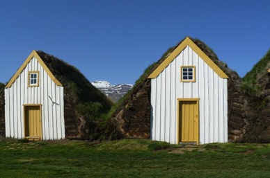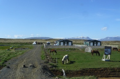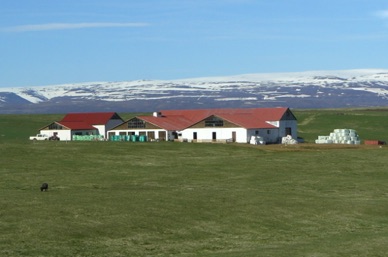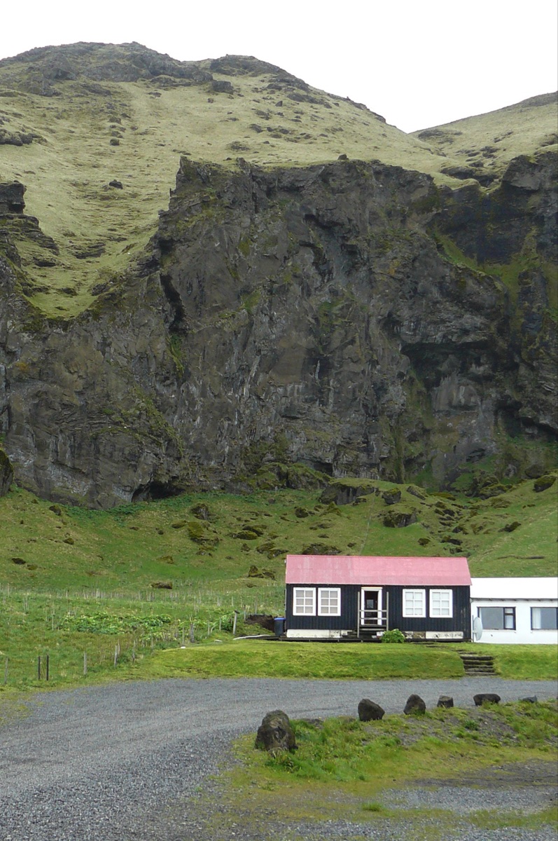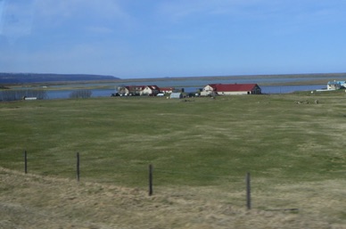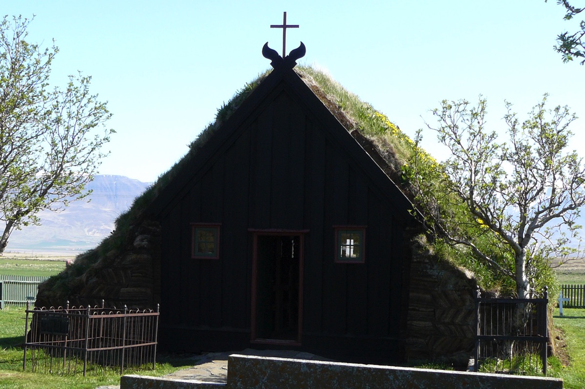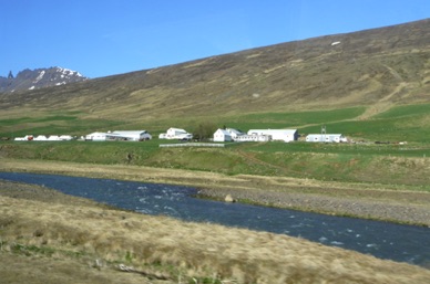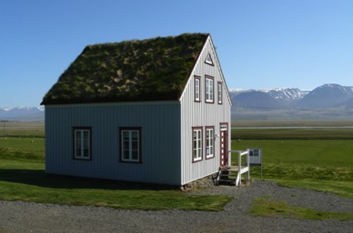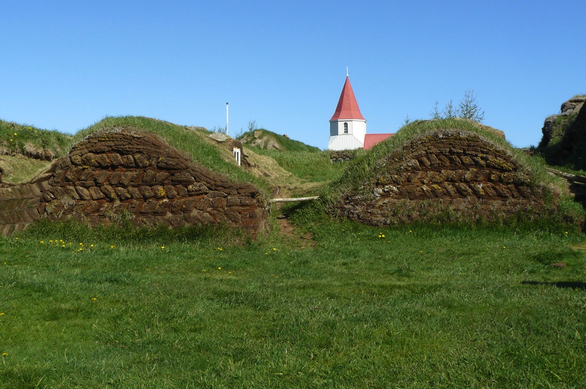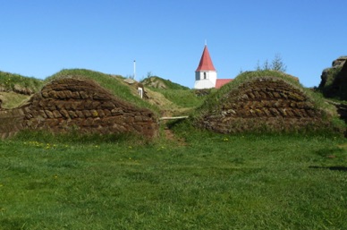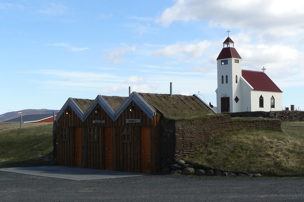 Village de KELDUR avec son poste à essence, son église et ses fermes aux toits de tourbe