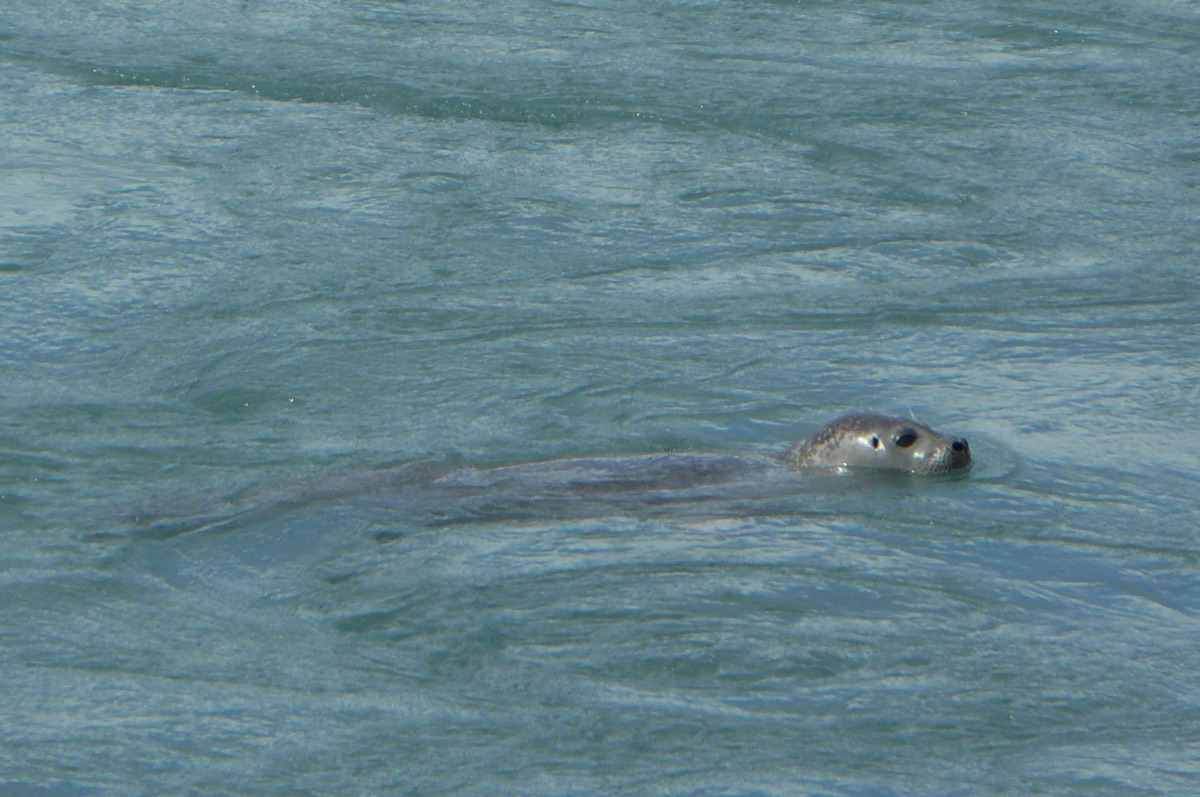phoque se promenant dans le chenal au milieu des icebergs