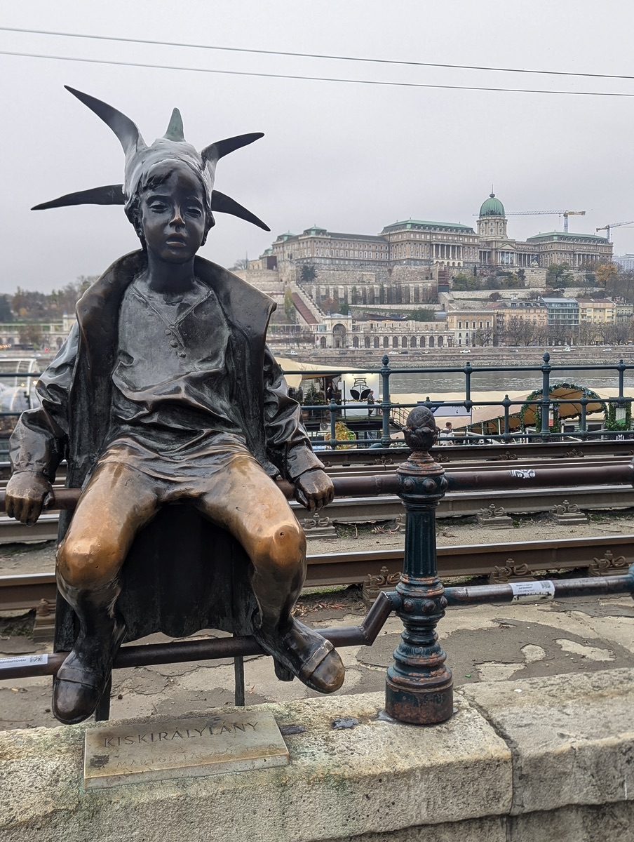 La Statue de la Petite Princesse assise sur la rambarde le long du Danube, porte une robe et une couronne pointue en papier.