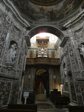 étonnante chapelle dont les vitrines sont remplies d'ossements et de crânes ...
