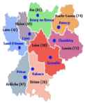 Cette région regroupe huit départements : l'Ain, l'Ardèche, la Drôme, l'Isère, la Loire, le Rhône, la Savoie et la Haute Savoie.
